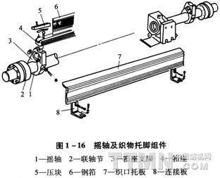 三、摇轴与织口托板 如图1—16,摇轴1通过两个联轴节2分别与左右打纬凸轮轴相连接。筘座4通过筘座支脚3固定在摇轴上,钢筘6装在筘座上,这样钢筘随摇轴便可形成打纬运动。为了加强刚性,摇轴上装有滑动轴承,轴承座固定在胸梁上。通过螺钉和压块5的斜面将钢筘6固定在筘座上。为了使织口保持平直,钢筘打纬时,避免织物过于抖动,筘座前面装有织口托板7。织口托板由连接板8通过螺钉固定在胸梁上。装在织机两侧的边撑将两布边压在织口托板上,并沿纬纱方向拉紧。