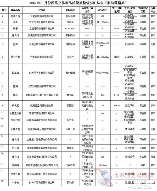 安徽省工商局抽检服装鞋帽合格率仅5.26%