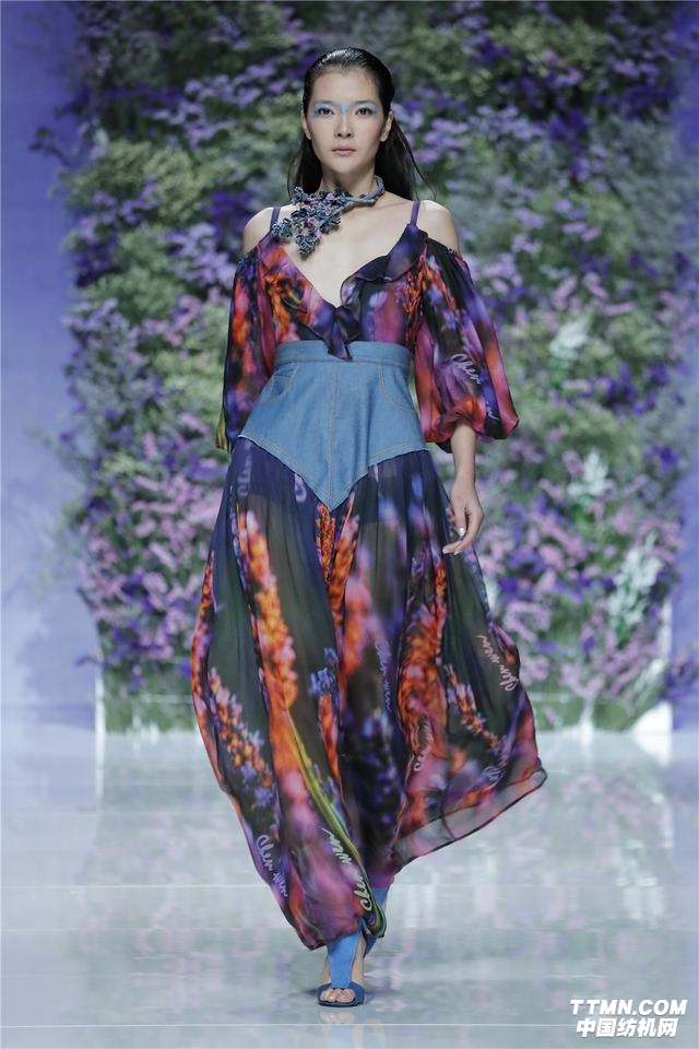 时装设计师陈闻,同时是一位艺术家,他将艺术与牛仔服装结合起来,创造性地发明了油画、国画、版画等水洗方法,使牛仔服装设计百变千姿,富于激情的笔触和色彩给予牛仔服饰注入新的时尚活力,本次 “丝路画语” 发布会融合东西文化,律动柔美阳刚,碰撞艺术时尚。设计师开创性地,将柔软的丝绸材质与硬朗的艺术化原创牛仔面料相结合,把普罗旺斯地区丰富多变的薰衣草自然色彩与牛仔面料上人工创造的复杂肌理结合,质感与色彩间产生的融合及对比,在结构设计中凸显,使牛仔服饰更具视觉冲击力,并在一定程度上彰显出东方时尚的韵味。在矛盾冲突中,追求并营造出一种视觉乃至心理上的激情感受,是艺术家们惯用的创作手法,陈闻将来自于艺术的创作体验转嫁到生活化的服装设计之中,使艺术落地,为大众所普遍欣赏,也使服装升华,让牛仔充溢着独特的魅力。