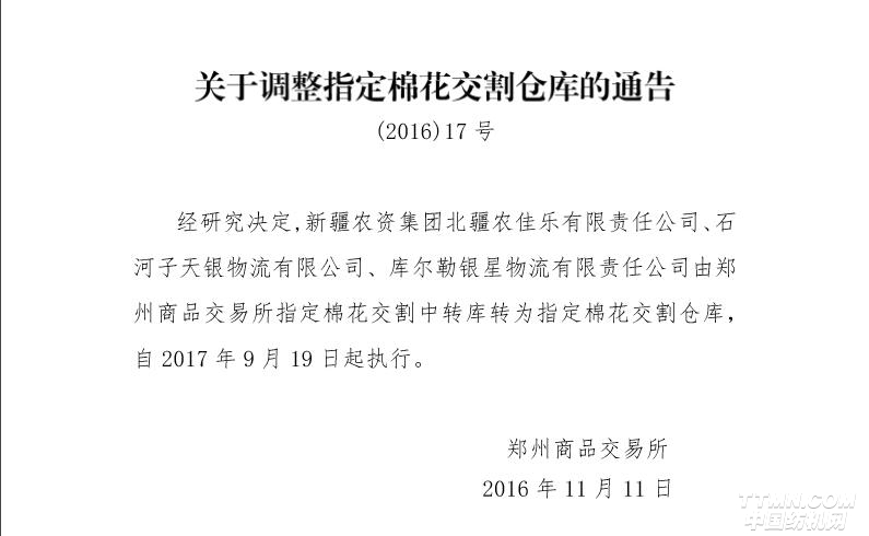 关于调整指定棉花交割仓库的通告