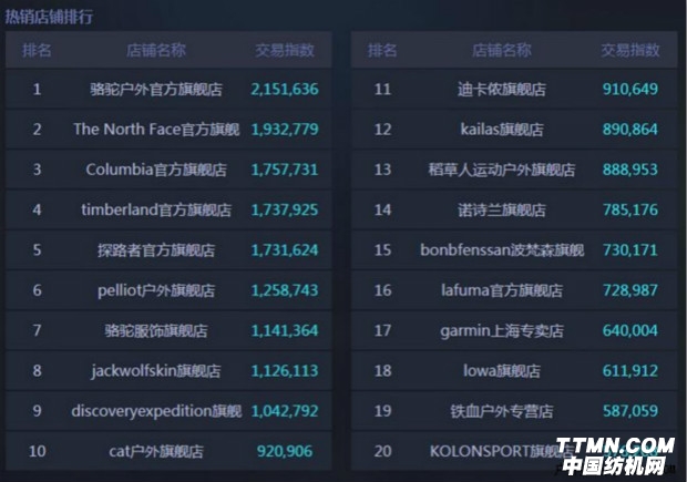 2016双十一0:00-10:00的天猫户外运动热销店铺排行榜(数据来源:生意参谋)