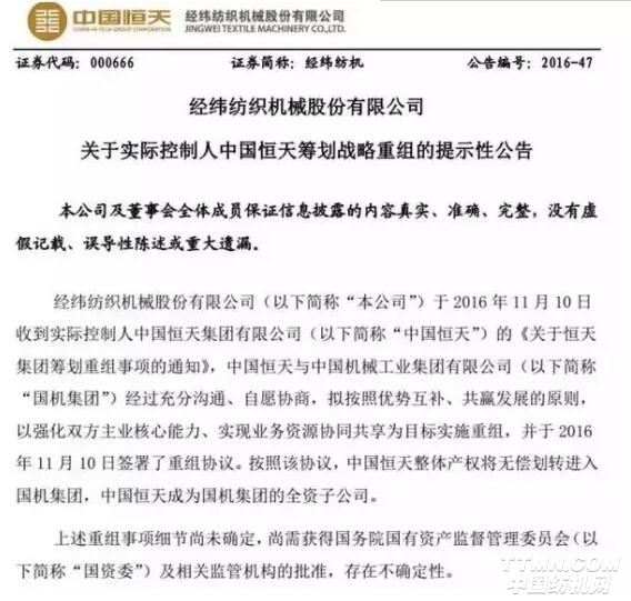 经纬纺机与凯马B昨日晚间发布公告称,中国恒天与中国机械工业集团有限公司拟按照优势互补、共赢发展的原则,以强化双方主业核心能力、实现业务资源协同共享为目标实施重组,并于10日签署重组协议。按照协议,中国恒天集团整体产权将无偿划转进入国机集团,并成为其全资子公司。