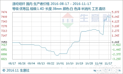 据生意社价格监测显示,11月17日涤纶短纤市场价格平稳,截止目前,1.4D*38mm的涤纶短纤市场均报价在7408元/吨,与上一日价格持平,同比上涨8.05%。