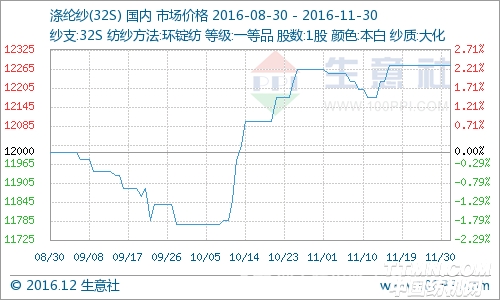 据生意社价格监测显示,11涤纶纱市场价格先跌后涨呈现“V“形走势,截止11月30日,32S的纯涤大化纱市场均报价在12275元/吨,较月初价格上涨了0.10%,同比上涨12.00%。