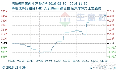 据生意社价格监测显示,11月涤纶短纤市场价格呈先跌后涨态势,截止11月30日,1.4D*38mm的涤纶短纤市场均报价在7478元/吨,较月初价格上涨了3.35%,同比上涨10.42%。
