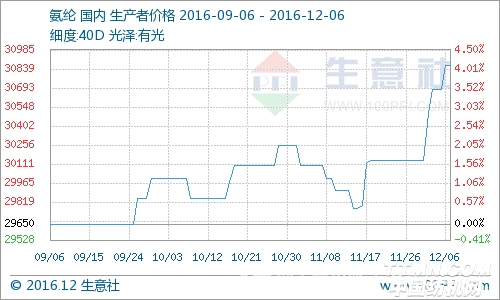 据生意社价格监测显示,12月6日氨纶市场价格平稳,40D规格的氨纶市场均报价在30863元/吨,与上一日价格持平,同比下跌15.90%。