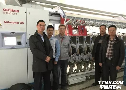 (图为赐来福团队和高阳工贸管理层在Autoconer络筒机旁的合影,左一为赐来福中国备件销售总监李毅博士,右二为高阳工贸董事长许惠忠先生)