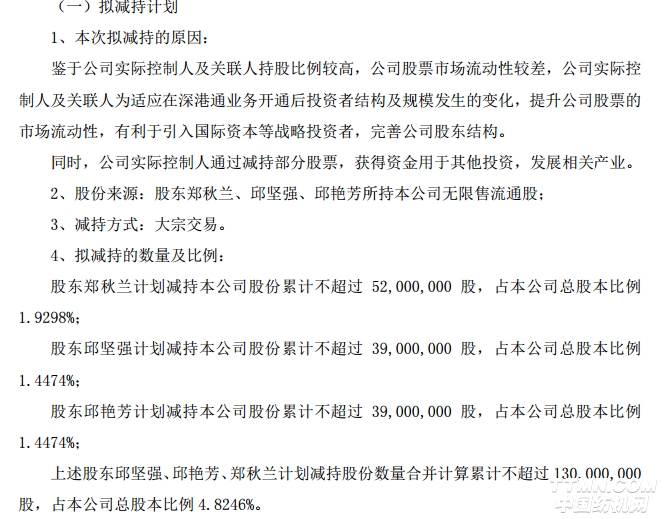 公告称,鉴于公司实际控制人及关联人持股比例较高,公司股票市场流动性较差,公司实际控制人及关联人为适应在深港通业务开通后投资者结构及规模发生的变化,提升公司股票的市场流动性,有利于引入国际资本等战略投资者,完善公司股东结构。同时,公司实际控制人通过减持部分股票,获得资金用于其他投资,发展相关产业。