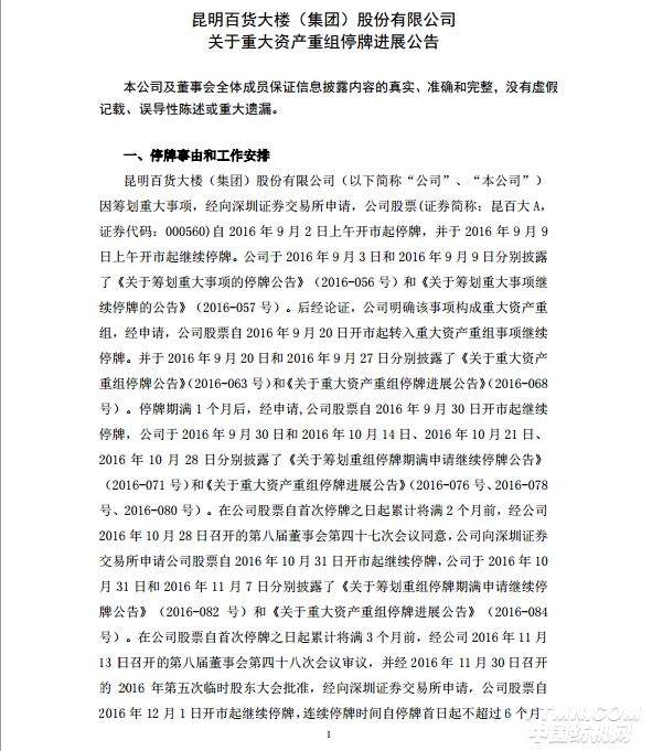 在股票自首次停牌之日起累计将满3个月前,经昆明百货大楼(集团)2016年11月13日召开的第八届董事会第四十八次会议审议,并经2016年11月30日召开的2016年第五次临时股东大会批准,经向深圳证券交易所申请,公司股票自2016年12月1日开市起继续停牌,连续停牌时间自停牌首日起不超过6个月,预计不晚于2017年3月1日披露本次重大资产重组预案(或报告书)并申请公司股票复牌。(联商网)