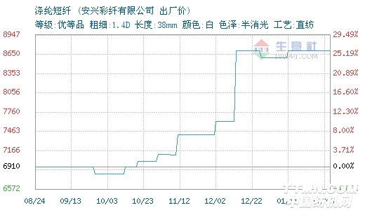 02月03日安兴彩纤有限公司关于涤纶短纤的报价为8700元/吨。涤纶短纤的出产地为安徽滁州;涤纶短纤的属性:等级:优等品;粗细:1.4D;长度:38mm;颜色:白;色泽:半消光;工艺:直纺。该报价有效期为7天。