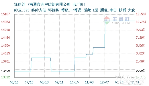02月03日南通市苏中纺织有限公司关于涤纶纱的报价为15000元/吨。涤纶纱的出产地为江苏南通;涤纶纱的属性:纱支:32S;纺纱方法:环锭纺;等级:一等品;股数:1股;颜色:本白;纱质:大化。该报价有效期为7天。