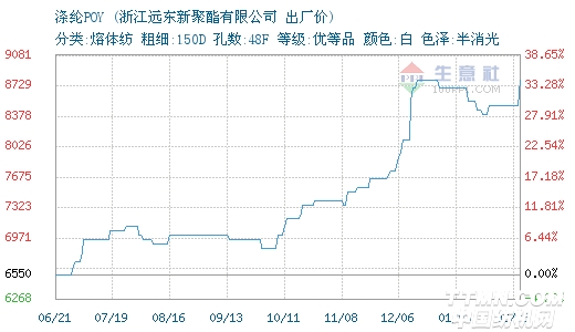 02月03日浙江远东新聚酯有限公司关于涤纶POY的报价为8800元/吨。涤纶POY的出产地为浙江绍兴;涤纶POY的属性:分类:熔体纺;粗细:150D;等级:优等品;孔数:48F;颜色:白;色泽:半消光。该报价有效期为1天。