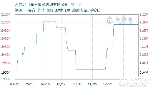 02月03日高密鲁源纺织有限公司关于人棉纱的报价为21000元/吨。人棉纱的出产地为山东;仓储地为山东省;人棉纱的属性:等级:一等品;纱支:30S;股数:1股;纺纱方法:环锭纺。该报价有效期为7天。