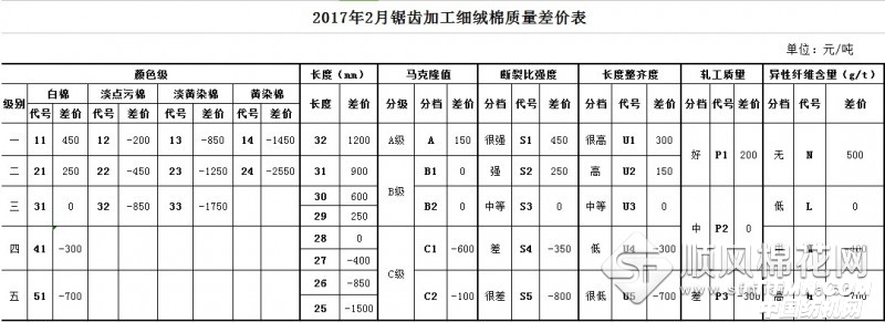 根据2017年1月棉花市场监测数据,与上月相比,本月对《锯齿加工细绒棉质量差价表》做出以下调整: