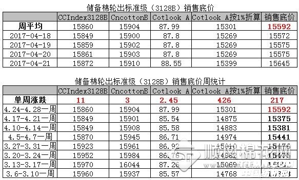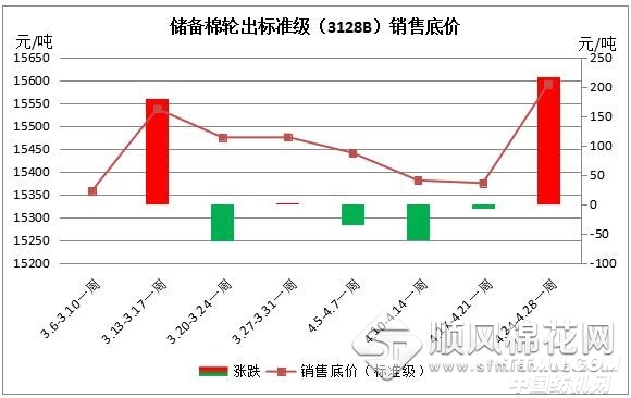 根据《关于国家储备棉轮换有关安排的公告 》(2016年第9号)内对储备棉轮出销售底价计算公式计算,2016/2017年度储备棉轮出(4月24日-4月28日一周)轮出销售底价为15592元/吨(标准级价格)较上周价格调升217元/吨;每日上市实际批次储备棉的销售底价,以标准级销售底价为依据,按棉花公证检验结果及中国棉花协会公布的有关质量差价表计算确定。