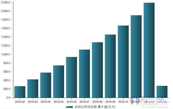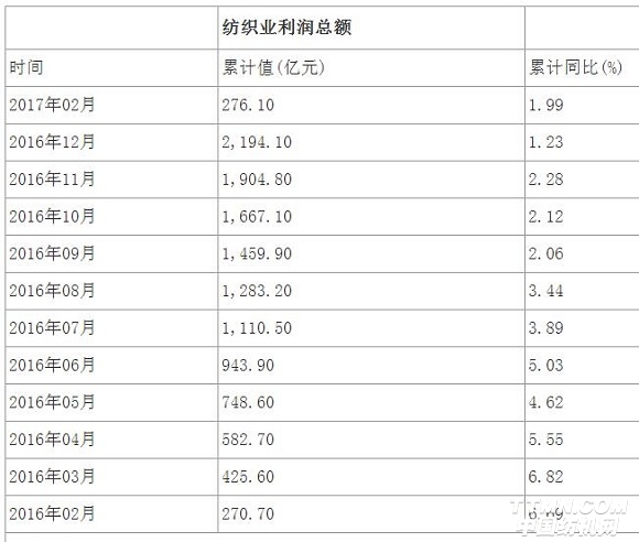 据前瞻数据库数据显示,2017年1-2月我国纺织业主营业务收入累计5815.4亿元,同比增速达6.26%,增速较2016年上涨4.53个百分点。其中利润总额276亿元,累计同比仅增长1.99%,增速虽环比微升,但同比下滑4.7个百分点。