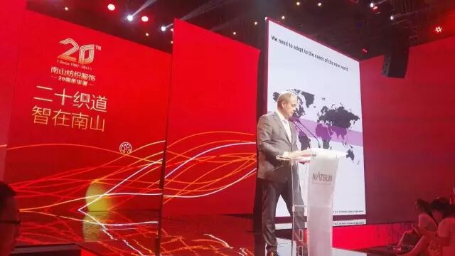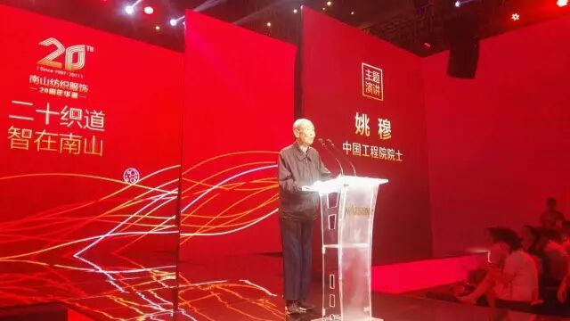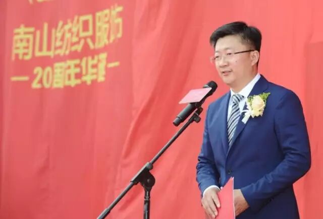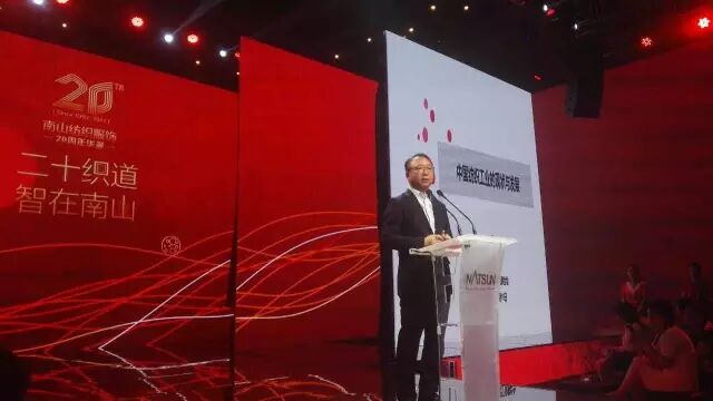 中国纺织工业联合会会长孙瑞哲在致辞时用“为有南山多壮志,敢叫纺织换新颜”来赞誉山东南山纺织服饰有限公司20年来所取得的成就,并寄语南山要成为中国纺织行业大军中,一个能融汇“创意、诗意、生意”为一身的卓越型企业。他表示:“南山集团作为领军企业,是中国纺织工业发展历程中居功至伟的标杆企业。‘追求卓越,注重创新,承担责任’,站在20周年的光荣起点,南山集团的这份责任——向内,意味着探索产品创新、技术升级、管理优化,持续增强内功;向外,意味着探索供应链上下游产业协同发展、资源共享平台建设、关键共性技术传导,带动产业不断进步,持续发挥优势企业的正向‘多米诺骨牌效应’。在‘内外兼修’的过程中,追求卓越品质、智能制造、价值协同、风格修炼、社会责任。这些发展目标的实现,需要我们秉承坚定的信仰,脚踏实地,不畏险阻,投入专注。”