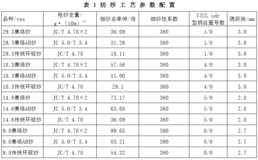 在QFA1528型细纱机上分别采用上述三种纺纱方法分别纺制JC/T60/4029.3tex、18.3tex、14.7tex、9.8tex混纺纱,纺纱工艺参数配置如表1所示。
