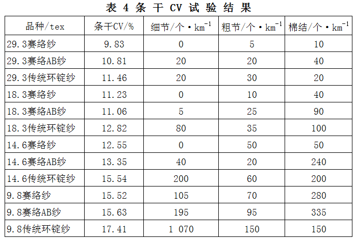 从表4可以看出,赛络纱、赛络AB纱的条干CV值和常发性纱疵明显优于传统环锭纱;赛络纱与赛络AB纱相比,条干CV值,除18.3tex纱外,赛络纱均稍优于赛络AB纱;常发性纱疵中,千米细节、千米棉结、千米粗节除14.6tex纱外,赛络纱均优于赛络AB纱,因此,赛络纱在条干质量方面略优于赛络AB纱。