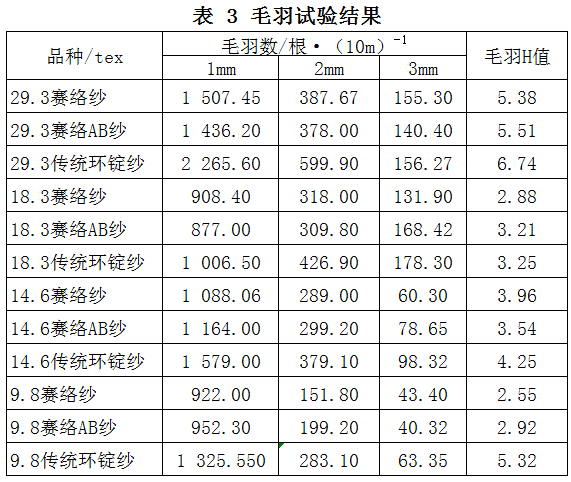由表3可知,赛络纺混纺纱与赛络纺AB混纺纱1mm~2mm短毛羽(由1mm档数据减去3mm档数据可计算出大于等于1mm小于3mm的毛羽根数)和3mm及以上长毛羽数差别不明显,但与传统环锭纺相比,毛羽总数和3mm及以上有害毛羽数量以及毛羽H值都明显减少。