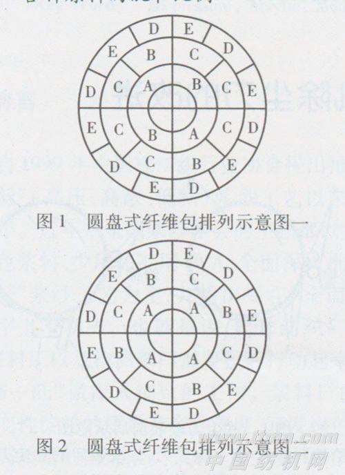 如果各种原料的比例没有一定的规律,则影响了纤维包的排列,最终影响纤维原料的混和效果。例如选用原料有A、B、C、D、E,其混用包数分别为4、4、4、6、6,则纤维包可按如图1排列:内环均匀排列A原料4包,中环B、C两种原料置于其内,B、C两种原料纤维包在中环内间隔交错排列,而外环为D、E两种原料,也交错排放。如果原料混和比例不凑巧,纤维包排列就比较困难。如以上五种原料的混和包数分别为2、4、6、6、6,则纤维包只能按图2方式排列比较合理。但是B原料的混和均匀性就不如前种好。
