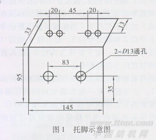 GA747型剑杆织机在织造稍窄品种时,由于筘幅减少,纬纱长度无法用释放凸轮调节,造成废边纱超长,纬纱消耗增加。将原装在出纱侧铝合金筘板上释放凸轮改装在筘座上(出纱侧轨道片下方),利用原筘座脚上两个M12螺钉,将改装托脚(见图1)固定其上,并在其上加工4个M6螺钉调节孔,将一套纬纱释放凸轮板固定其上。经以上改装后,筘幅调节范围增加12.7 cm以上。