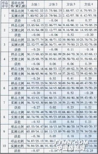 由表4可得,四种定量分析方法对相同混纺比例的聚乳酸纤维/棉混纺样品的连续5次分析结果误差均小于土1%,可见这四种分析方法的精密度也均满足GB/T 2910--1997标准的要求。2.4 四种定量分析方法的准确度和精密度比较四种不同定量分析方法对聚乳酸纤维/棉混纺样品适用性比较见表5。表5四种不同定量分析方法适用性比较