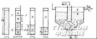 图4 区域沉降图 5沉淀池中没泥分布示意图A-清水层 B-受阻层C-过渡层 D-压缩层