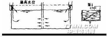 如图所示,调节池液面可以上下自由波劫,当进水量大于出水量时,则池内应能贮存盈余,反之,应能补充短缺,以此实现水量调节。池底设置沉渣斗,通过排渣管定期排渣。