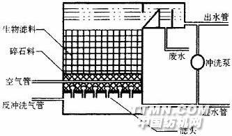 解酸化池的池容就得不到充分利用,实际水力停留时间大大小于理论水力停留时间,水解酸化工艺就难以取得良好的效果。 在水解酸化工艺中,笔者采用升流式水解污泥床反应器,污水均匀布在整个池底部,废水在上升时穿透整个污泥层并进行泥水分离,上清液从集水槽出水进入后续好氧处理工序。布水均匀性和泥水混合采用脉冲布水器控制,进水首先进入脉冲布水器,贮存3~5分钟的水量,然后自动形成虹吸脉冲,整个布水器内的水在10余秒内通过丰字型管道系统均匀布于池底,丰字型管道上布水孔的出孔流速大于2米/秒,这样,池底部的泥水进行剧烈混合,充分反应。经过水解酸化处理的废水pH值能从10降至8左右,部分印染废水(如活性红印染废水)色度的去除能达到70~80%。良好的水解酸化处理工艺能大大提高污水的可生化性,进而提高后续好氧处理的去除率,是整个污水处理工程水质达标的重要措施。