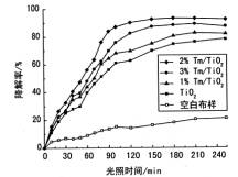 图1为Tm/TiO2摩尔分数比对污物降解率的影响, TiO2和Tm/ TiO2溶胶质量浓度均为