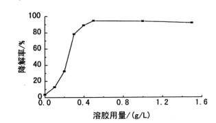 由图2可知,溶胶用量较少时,污物降解率较低,这是因为光源产生的光子不能被充分吸收,光催化反应效率较低;增加溶胶用量,污物降解率迅速升高,当溶胶质量浓度为
