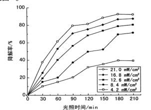 由图4可知,随着光照强度的增加,污物降解率逐渐提高;光源强度为21.0 mW/cm2时,光照180min后污物降解率可达到92%。Tm/ Ti02受光激发产生的电子和空穴浓度会影响污物降解速率。Bahnemann D等[10]研究表明,较低光强下,污物降解速率与光强呈线性关系;中等强度光强下,污物降解速率与光强的平方根呈线性关系。因此,在4.2-21.O mW/cm2的低光强下,污物降解率随光照强度增加而提高。较适宜的光照强度为21.0 mW/cm2。