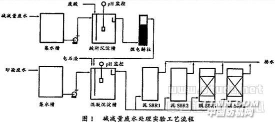 化纤印染厂生产排放印花染色废水和碱减量生产废水。涤纶仿真丝纤维在高温、高碱度条件下被减量,PTA溶入碱液中。碱减量废水中CODcr和碱含量极高,给废水处理增加难度[1][2]。本文提出一种应用工业废料的碱减量废水处理新技术,实验研究表明有效、可靠、廉价,适合印染碱减量废水处理。1 实验工艺实验工艺流程如图1所示。