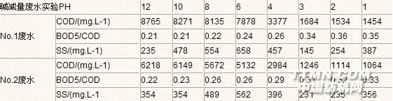 取铸铁屑,用5%盐酸浸泡清洗,加1%JHH活化剂溶液浸泡6h后,装入微电解柱待用。SBR槽各投加活性污泥2L,其中2槽悬挂30%软性填料,污泥驯化2周,周期COD去除率约80%~85%,待用。2 静态实验结果和讨论2.1 酸析静态试验 水质:碱减量废水,No.1:NaOH 2.4%,COD 8854mg/L,BOD5 1845mg/L, SS 350 mg/L;No.2:pH 14,COD 6524 mg/L,BOD5 1283 mg/L, SS 136mg/L。表1 碱减量废水酸析点对COD 和 BOD5/COD的影响