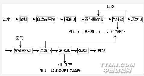.png) 2.2 工艺特点 ① 以循环回用为设计主导思想,以废水零排放为设计目标,最终达到重污染企业对环境的无害化。 ② 以气浮工艺为主要环节。洗毛废水中含有大量羊毛脂、洗涤剂以及细小悬浮物,当加入混凝剂后便可形成大量网状结构的矾花,*加压溶气气浮微气泡的浮力,将矾花带到水面,从而达到大幅度去除水中羊毛脂、SS、ABS、COD的目的;同时将气浮出水以大比例(原液的5倍)的回流稀释原液以稳定气浮出水水质,降低后续处理的难度。 ③ 以生化处理为后续控制环节。废水经气浮工艺处理后,残留在水中的主要是一些溶解性有机物,以厌氧工艺提高废水的可生化性,然后用接触氧化法充分降解有机污染物,消除因大回流而可能产生的有机物累积,为废水的达标排放和回用创造稳定的水质条件。2.3 主要构筑物 各构筑物均为钢混或砖混结构。主要构筑物: ① 自然沉降沟 地下式,共二组,单组尺寸:30m×0.5m×0.3m,二组轮流使用和清泥。 ② 隔油池 地下式,尺寸:2m×1m×3m,为底部连通式二格,顺流式进水,逆流式出水。利用油脂与水的比重差,将油脂截留在进水格,形成油脂层,然后通过人工清捞。 ③ 调节回流池 地下式,尺寸:6m×10m×2.6m,水力停留时间4h。 ④ 气浮池 平流式,尺寸:3.75m&