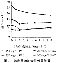 1.2 试验方法 取含油乳化废水水样300mL于500mL烧杯中,加入不同量的药剂,在200r/min的转速下快搅1min,然后转速降至100r/min,继续搅拌3min,然后进行气浮,取浮渣下10cm处水样测定水质。