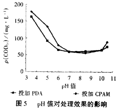 图1~图4是CPAM、PDA与PAC在不同复配比例条件下的处理效果。可以看出,投加CPAM或PDA可以明显改善处理效果,这是由于阳离子有机絮凝剂中阳离于对废水中的乳化油滴起到了电荷中和及压缩双电层的作用,促使乳化油滴进一步破巩析出,而且有机絮凝剂有很长的分子链,能在经凝聚作用形成的胶体颗粒矾花间进行架桥,形成大而坚韧的絮凝体[3],从而改善絮凝体性能。因此,这两类絮凝剂配合使用可以有效的提高CODcr和油的去除率,并且改善絮凝体性能,提高气浮分高效果。 随着有机药剂投药量的增加,水样出现了不同程度的再稳现象。这是由于有机絮凝剂分子将废水中的胶体颗粒表面的活性点包裹,使架桥变得困难,导致处理效果变坏;也可能是由于阳离子数量增加使胶体表面带有了正电荷,从而使胶体重新稳定。 试验得到废水达到排放标准时PAC与CPAM或 PDA复配最佳投量分别为:250mg/L PAC+2mg/L CPAM,200mg/L PAC+4mg/L PDA。与单独使用PAC需要300mg/L相比,很少量阳离子有机絮凝剂的加入可以明显的减少无机絮凝剂的投加量,从而节省药剂费用。2.3 pH值对处理效果的影响 图5为CPAM及PDA与PAC在最佳