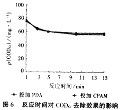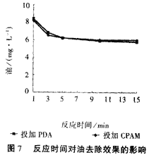 2.4 反应时间对处理效果的影响 试验发现,搅拌时间对废水处理效果有一定的影响,尤其是反应时间即慢搅阶段的时间长短对处理效果产生了较大的影响。图6、图7是反应时间对处理效果的影响。药剂投量为最佳复配投量。