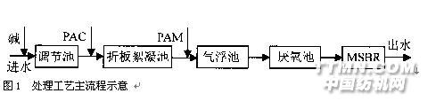 采用物化-生化组合处理工艺。物化部分采用混凝气浮,生化部分采用厌氧和组合式MSBR反应池。其工艺流程见图1。