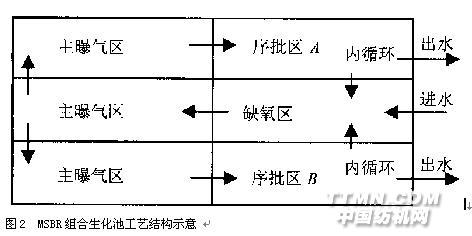 组合式生化反应池共3组,采用钢筋混凝土结构。每组反应池为一矩形水池,用隔墙分为缺氧区,主曝气区,序批区(2个)。工艺结构见图2。污水连续进入缺氧区、主曝气区,然后进入序批区,两个序批区交替充当沉淀池周期运行。若序批区?A沉淀出水,则序批区B 进行缺氧、好氧和静止沉淀等序批反应。序批区B在进行缺、好氧反应的同时,回流混合液进入缺氧区与原污水混合。半个周期结束后,序批区A和序批区B的功能交换,剩余污泥在序批区沉淀出水的后期排放。?