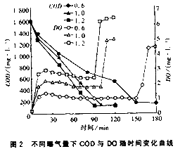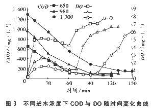 从图中可以看出,反应开始8~10min左右,不同曝气量下DO值显著不同。曝气量越小,此时的DO值越低,致使整个反应过程DO处于较低水平,大大延长了反应时间。随着曝气量的增大,初始DO值也在增大,带来整个反应过程DO的提高,缩短了有机物达到难降解程度的时间,即减少了反应时间。但是,过分地增大曝气量,初始DO的过高会造成整个过程DO处于过高的水平,却不能有效地缩短反应时间,还造成能量的巨大浪费。产生这种现象可以从耗氧速率与DO的相关关系的研究中得到解释,因为在低DO浓度下,DO浓度对生化反应速率的影响较大。当DO在1~2mg/L范围内,随着DO的提高,耗氧速率大幅度提高,标志着有机物降解速率的加快,从而缩短反应时间。当DO超过2mg/L后,继续增大DO值,由于受污泥浓度(MLSS)的限制,有机物降解速率的增加幅度较小。? 取进水COD浓度分别为400、600、800、1000、1