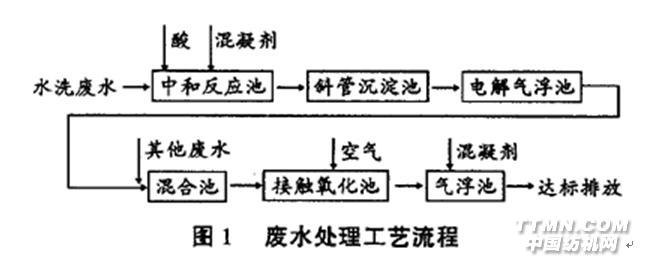某染料化工厂年产钴酞菁类染料500t,在生产过程中排放钴酞菁水洗废水、染料水洗废水及各车间的工艺冲洗废水。废水中含有多种染料中间体及大量无机原料,其中最主要的成分为N-N二甲基丙二胺和钻离子。该废水具有污染物浓度大、色度高、可生化性差等特点,在研究过程中,对混和废水进行了多次试验,包括电解气浮法、化学氧化法、活性炭吸附法、好氧生化法、混凝沉淀法等。试验结果表明采用电解法对钻酞青废水进行预处理有明显效果,主要表现在CODcr大幅度下降,BOD5与CODcr的质量比从0.05上升到0.33,提高了废水的可生化性。经过工程实践证明,运用电解法对钴酞菁废水进行预处理,在后续工段采用生化、物化处理,可使该废水经处理后达到国家二级排放标准。 1 废水的水质、水量及排放标准1.1 废水的水质、水量 钴酞菁混合废水的水质、水量见表1。表1 钴酞菁混合废水的水质、水量 | ||||||