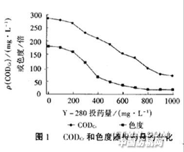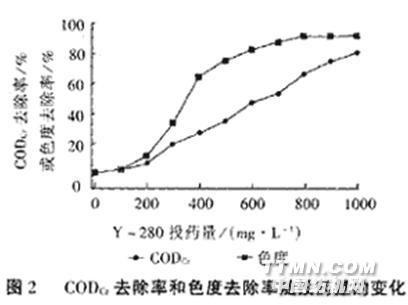 1.1 实验用水 废水为绍兴污水处理厂含印染工业废水约为80%的印染-生活混合型城市污水,水质特征为ρ(CODcr)287mg/L、色度180倍、pH值7.87。 该城市污水处理厂的污水执行纺织染整工业水污染物二级排放标准(GB4287-92),即ρ(CODcr)≤180mg/L、色度≤80倍、ρ(SS)≤100mg/L、pH值6~9。污水经生化处理后CODcr和色度还不能达标,需要经过混凝处理才可排放。1.2 实验方法 量取废水水样1000mL于烧杯中,在六联搅拌机上进行混凝实验。搅拌条件下加入Y280药剂后以150r/min的转速快速搅拌1min,再以50r/min的转速慢搅10min,静置30min后取液面以下