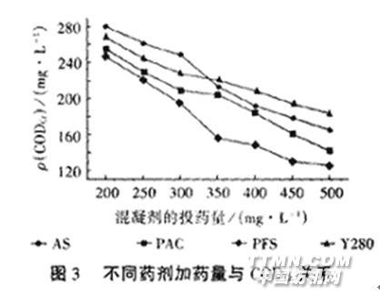 分析混凝实验结果图1和图2可知,在Y280的加药量为400mg/L时色度能达标,CODcr达标的Y280加药量为520mg/L,达标时Y280对这种废水的CODcr去除率为40%,色度去除率为75%。在Y280的投加量为1000mg/L时可出现最好的水处理效果,此时CODcr去除率达80%以上;色度去除率可达90%以上。2.2 Y280与常用混凝剂的用量比较 硫酸铝(AS),聚合氯化铝(PAC),聚合硫酸铁(PFS)是常用的混凝剂,为了进一步了解Y280的水处理性能,将其与AS,PAC,PF