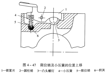 纺纱器经两三年运转后,有的纺纱器会出现开启困难,其原因一是锁紧片限位销凹槽内的积灰太多,造成限位销及小压簧的位置上移,如图4—47所示。二是锁紧凸头螺钉弯曲向上翘头,当需要开启纺纱器向下揿压锁紧片时,锁紧片揿不到位,它的圆弧最高处仍低于凸头螺钉的上弧面,这时纺纱器仍处于被锁状态,所以不能开启。