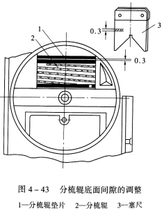 分梳辊底面与分梳腔底面之间应保持0.3mm间隙。若间隙太小,有可能造成分梳辊与分梳腔之间发生摩擦,影响分梳辊转速,进而影响分梳效果和排杂作用;若间隙太大,则会减小分梳辊上端面与上盖板之间的空隙,造成补风困难且分梳辊上端面容易产生积灰和积花。调整分梳辊底面间隙时,应先把分梳辊放人分梳腔;然后把专用塞尺(图3—34)放在分梳辊下端,并向前推动分梳辊,待其夹紧后,旋紧分梳辊的顶头螺