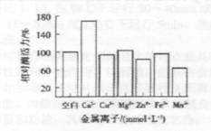 各种金属离子对碱性果胶酶酶活的影响见图5。