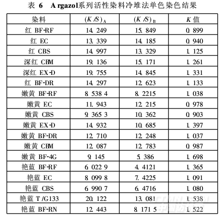 如表6所示,在单色染色中,冷堆染色的染液用量为20 g/L,其它染色工艺参数见1. 2. 2节。