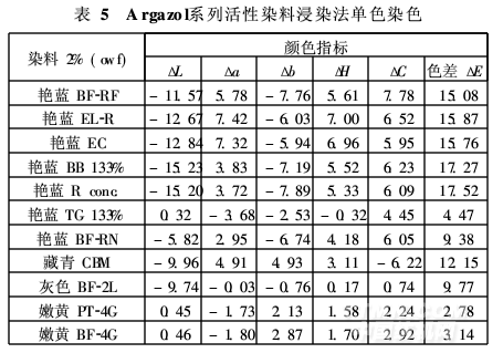 Argazol系列活性染料品种较多,本文选择蓝色系列及部分同色性良好的染料对粘/棉交织物进行60℃恒温浸染工艺染色,测试以粘胶面的颜色属性作为标准,与棉面的测试数据进行对比,其颜色数据见表5。